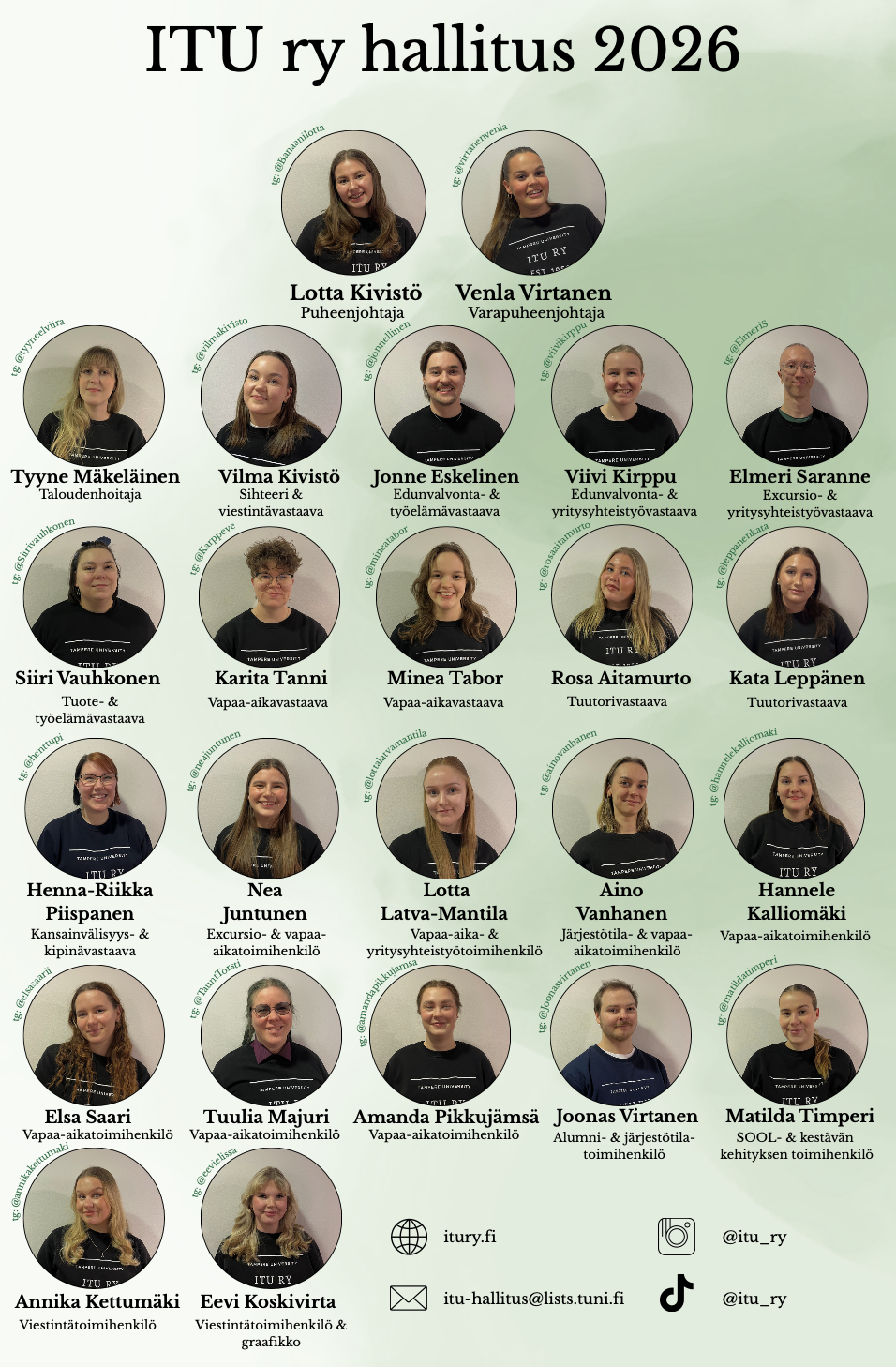 Täältä löydät ITU ry:n 2026 hallituksen jäsenten nimet, pestit ja yhteystiedot (sähköposti ja telegram)